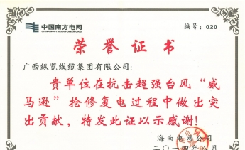 全國(guó)電線(xiàn)電纜產(chǎn)品質(zhì)量監(jiān)管AA級(jí)企業(yè),全國(guó)重合同守信用單位,廣西“二十五”電線(xiàn)電纜產(chǎn)業(yè)重點(diǎn)扶持企業(yè),國(guó)家強(qiáng)制性產(chǎn)品CCC認(rèn)證