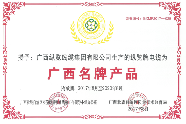 2017年8月廣西壯族自治區(qū)質(zhì)量技術(shù)監(jiān)督局 廣西壯族自治區(qū)實(shí)施質(zhì)量強(qiáng)桂戰(zhàn)略工作領(lǐng)導(dǎo)小組辦公室 授予廣西縱覽線纜集團(tuán)有限公司生產(chǎn)的縱覽牌電纜為廣西名牌產(chǎn)品 |