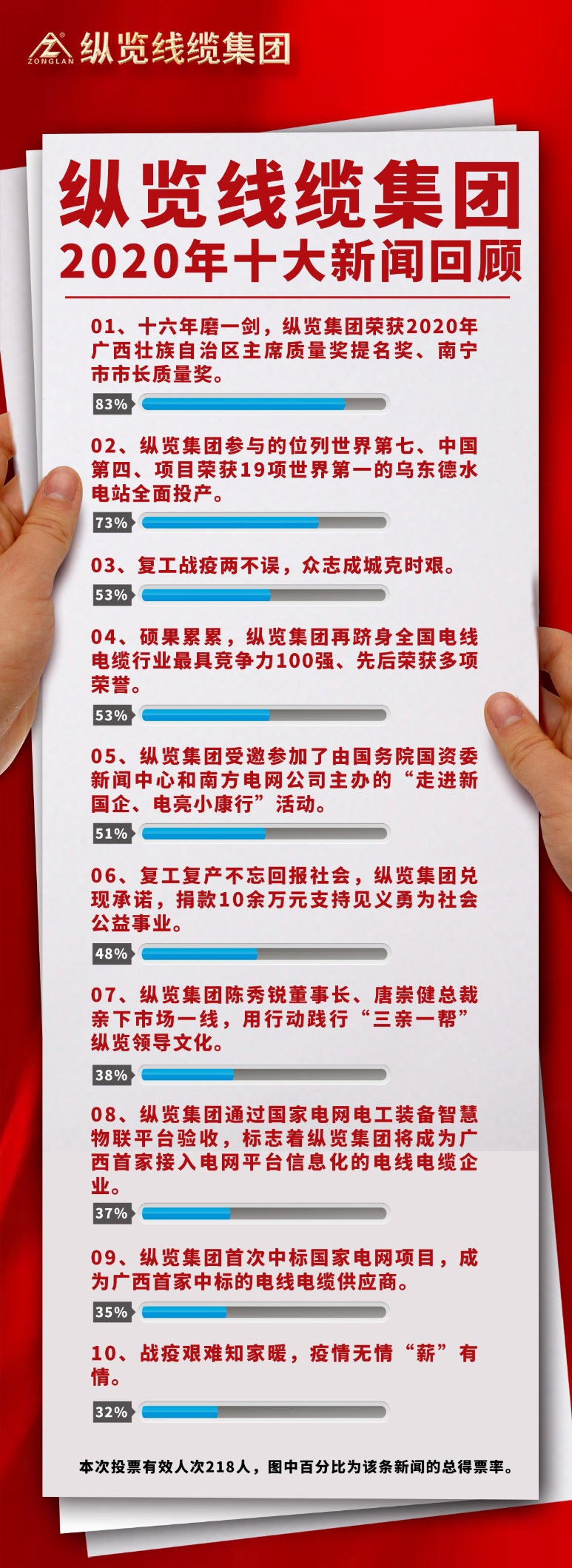 為了讓更多的縱覽人主動關(guān)心公司的發(fā)展與成長,共享成果的自豪與榮耀,值此一元復(fù)始之際,公司特舉辦“2020年度十大新聞”評選活動,經(jīng)過大家的積極投票,評選出了“縱覽線纜集團2020年度十大新聞”,讓我們一起來回顧一下! 1、復(fù)工戰(zhàn)疫兩不誤,眾志成城克時艱。 2020年1月26日大年初二起,縱覽人即同全國人民一起防疫戰(zhàn)疫,與“新冠肺炎病毒”展開了一場生死的較量。1月30日當(dāng)全國人民還放放假閉關(guān)中,縱覽即因戰(zhàn)疫需要,成立了以陳秀銳董事長為首的“縱覽疫情防控支援突擊隊”,快速啟動突發(fā)事件應(yīng)急預(yù)案,先后組織向各地電網(wǎng)救災(zāi)一線勇士們捐獻(xiàn)疫情緊缺物資口罩一萬枚,緊急組織供貨約2000萬元的電纜援建“小湯山式”疫情醫(yī)院……縱覽戰(zhàn)疫故事先后被廣西電視臺、電線電纜報、中國機械工業(yè)協(xié)會等多家媒體多次報道,成為抗擊疫情行動的先進(jìn)單位。 疫情防控關(guān)乎生命,而安全復(fù)工則關(guān)乎員工生計、企業(yè)的命脈和社會穩(wěn)定,因此,如何安全復(fù)工,減少疫情對經(jīng)濟的影響、對企業(yè)和員工的影響是企業(yè)疫情防控之外的另一場硬仗。萬難之際,縱覽人眾志成城,從疫情防護(hù)物資的急采配置、廠區(qū)嚴(yán)控出入、員工日健康信息報告、返廠隔離、防疫培訓(xùn)、用餐隔離到公司領(lǐng)導(dǎo)精準(zhǔn)施策、管理層執(zhí)行不打折扣,加班產(chǎn)出、加班發(fā)貨等等,無不顯示出縱覽人將壓力變?yōu)閯恿?、化危為機、戰(zhàn)勝疫情和經(jīng)濟壓力的勇氣和信心。 2、十六年磨一劍,縱覽集團榮獲2020年廣西壯族自治區(qū)主席質(zhì)量獎提名獎、南寧市市長質(zhì)量獎。 十六年磨一劍,2020年12月,縱覽集團先后榮獲廣西壯族自治區(qū)主席質(zhì)量獎提名獎、南寧市市長質(zhì)量獎,企業(yè)經(jīng)營成果和質(zhì)量管理水平得到政府部門的高度認(rèn)可。 面對集團首次申報、經(jīng)驗不足、競爭強手如林的不利情況下,陳秀銳董事長要求創(chuàng)獎團隊誓必成功,唐崇健總裁帶領(lǐng)創(chuàng)獎團隊擰成一股繩,日以繼夜,以卓越績效管理體系為綱,不斷突破、對公司各業(yè)務(wù)版塊的信息資料進(jìn)行收集和整理,通過多次會議和頭腦風(fēng)暴,深挖亮點,組織編寫了超17萬字的創(chuàng)獎申報材料、制作了15個現(xiàn)場匯報的PPT,同時,通過對匯報和評審的反復(fù)演練,終于在各環(huán)節(jié)以出色的表現(xiàn)贏得了評審專家的肯定,獲得了高分,一鼓作氣連續(xù)拿下廣西壯族自治區(qū)主席質(zhì)量獎提名獎和南寧市市長質(zhì)量獎,成為創(chuàng)獎企業(yè)中的黑馬。 廣西壯族自治區(qū)主席質(zhì)量獎是廣西壯族自治區(qū)實施質(zhì)量興桂戰(zhàn)略工作領(lǐng)導(dǎo)小組組織實施,主要授予有廣泛的社會知名度和影響力、實施卓越績效管理模式、質(zhì)量管理水平和自主創(chuàng)新能力在國內(nèi)同行業(yè)處于領(lǐng)先地位、取得顯著經(jīng)濟效益和社會效益的企業(yè)和相關(guān)組織,該獎項評選標(biāo)準(zhǔn)高、評審過程嚴(yán),每屆獲獎的企業(yè)或組織總數(shù)不超過4個,提名獎不超過8個??v覽集團作為民營企業(yè),能在強手如林的國企、央企、上市公司中脫穎而出,獲得政府和各界的認(rèn)可,實屬不易。 3、戰(zhàn)疫艱難知家暖,疫情無情“薪”有情。 2020年1月底,因疫情影響企業(yè)復(fù)工延期,部分企業(yè)被迫停產(chǎn)、陷入經(jīng)營危機。為讓縱覽家人安心 ,公司及時發(fā)布疫情時期的薪資發(fā)放政策,政策不僅明確了員工疫情時期的生活保障,還暖心地對疫情期奮戰(zhàn)在生產(chǎn)一線的操作工、保安人員給予了工資以外的激勵補貼,讓員工們在不安的環(huán)境中因企業(yè)的擔(dān)當(dāng)而感受到了安全,感受到了艱難時公司對員工的關(guān)愛和縱覽大家庭的溫暖。