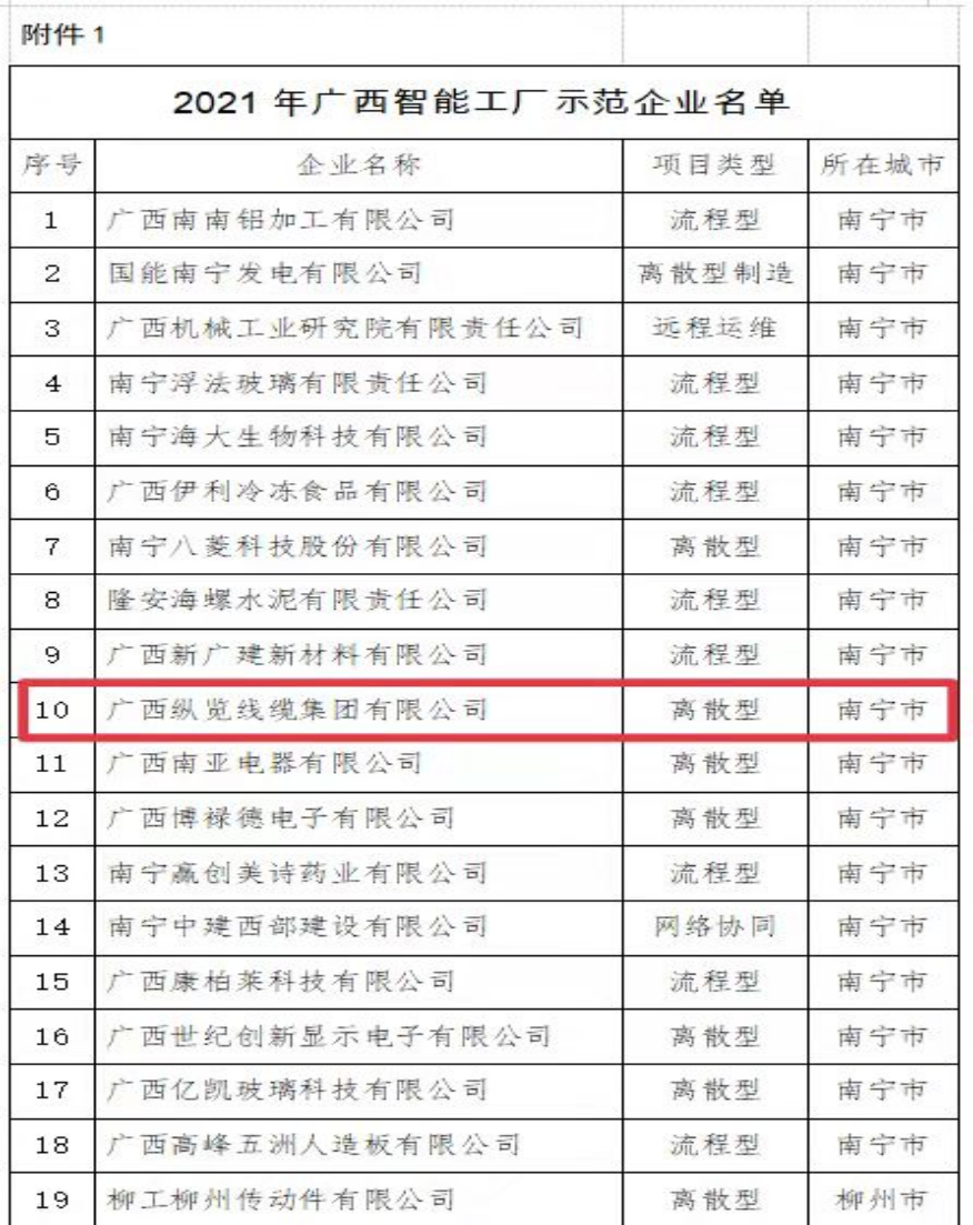 12月3日,自治區(qū)工業(yè)和信息化廳發(fā)布了關(guān)于公布2021年廣西智能工廠示范企業(yè)和數(shù)字化車間名單的通知,我集團(tuán)成功入選2021年廣西智能工廠示范企業(yè)名單,獲得“廣西智能工廠示范企業(yè)”榮譽(yù)稱號。標(biāo)志著縱覽線纜集團(tuán)生產(chǎn)制造、產(chǎn)品質(zhì)量把控能力和水平邁上一個新的臺階,市場競爭力進(jìn)一步增強(qiáng)。 |