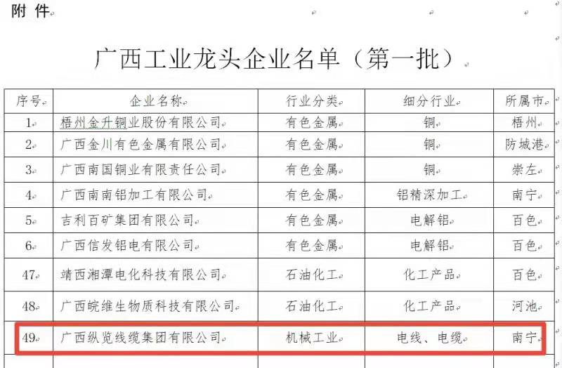 12月16日,自治區(qū)工業(yè)和信息化廳公布了關于廣西工業(yè)龍頭企業(yè)名單(第一批)的通知,縱覽線纜集團再次榮膺“廣西工業(yè)龍頭企業(yè)”! 集團始終乗持"做好產品回報客戶,做好企業(yè)回報社會"使命,堅守質量底線,注重科技創(chuàng)新,在高質量發(fā)展的軌道上跑出自己的工業(yè)加速度。持續(xù)榮獲"廣西龍頭企業(yè)"榮譽稱號,是對集團莫大的鼓舞,是對集團經營發(fā)展高度認可。未來,集團將進一步做好精細管理,明確發(fā)展目標,加強新四化戰(zhàn)略指引,勵精圖治,助力廣西電線電纜高質量發(fā)展。 |