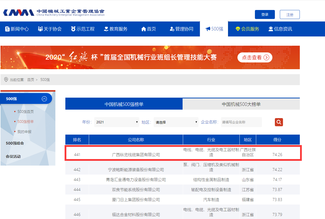 日前,2021年中國機械500強榜單發(fā)布,廣西縱覽線纜集團有限公司位列441強,是廣西電線電纜行業(yè)唯一上榜企業(yè)。在新冠疫情和原材料價格高漲疊加因素環(huán)境下,我集團連續(xù)上榜中國機械500強企業(yè)榜單,充分彰顯了縱覽線纜集團在科研技術(shù)、質(zhì)量管控、市場開拓、創(chuàng)新發(fā)展上的綜合實力和高質(zhì)量發(fā)展的水平,將有力促進縱覽品牌的美譽度和市場影響力。