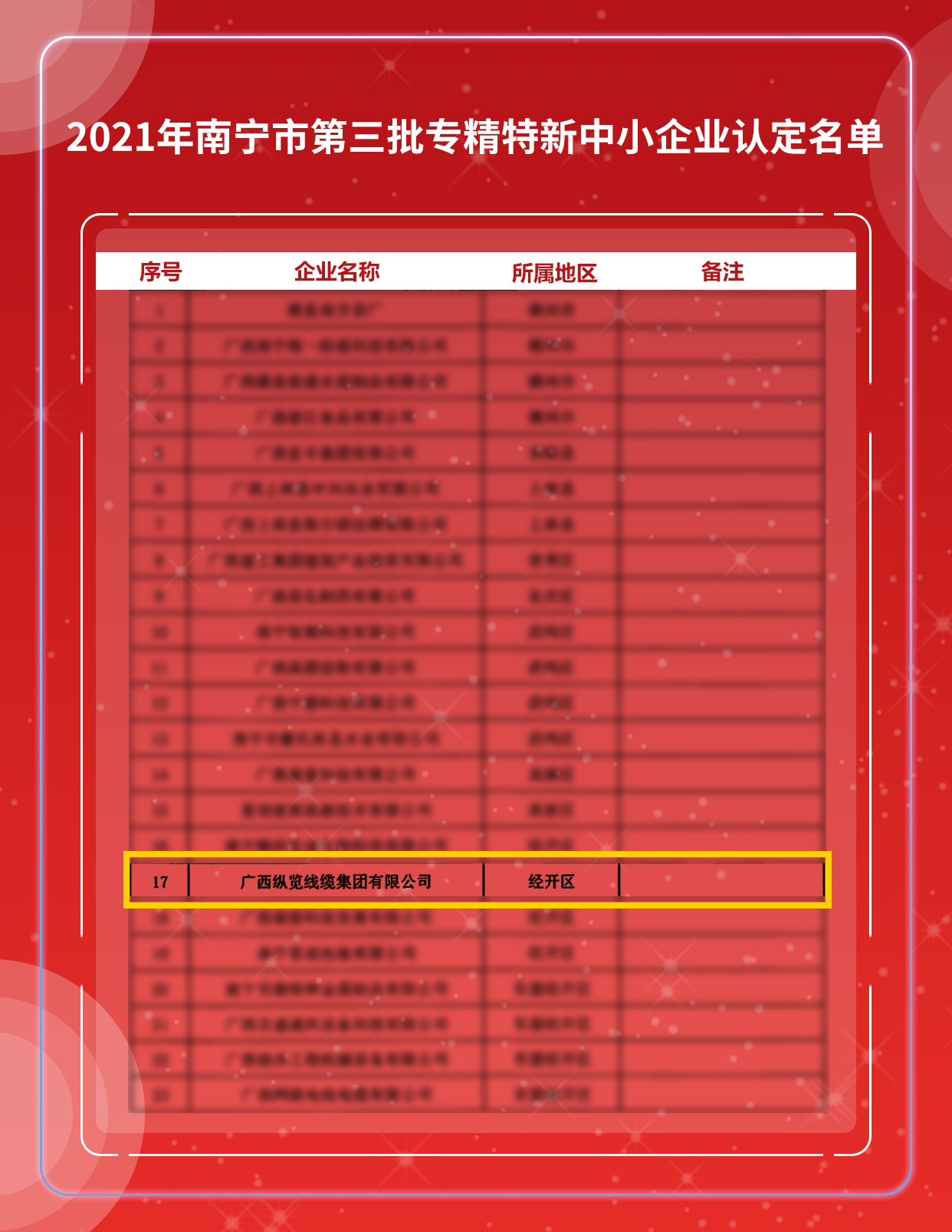 近日,南寧市發(fā)布《關(guān)于認(rèn)定2021年度南寧市第三批“專精特新”中小企業(yè)的通知》,我集團公司順利通過認(rèn)定,成為“南寧市專精特新”企業(yè)。近年來,我集團在科技創(chuàng)新能力、智能化生產(chǎn)、全過程質(zhì)量管控、動力線纜市場占有率、質(zhì)量效益方面走在行業(yè)前列,市場競爭優(yōu)勢突出。當(dāng)前已成為南方電網(wǎng)在廣西電線電纜行業(yè)中唯一的線纜供應(yīng)商,也是南方電網(wǎng)最大的線纜供應(yīng)商。入選“專精特新”企業(yè),有利于進一步促進我集團高質(zhì)量發(fā)展,更好地服務(wù)和融入“強首府戰(zhàn)略”,推動生產(chǎn)力制造水平再上新臺階。 |