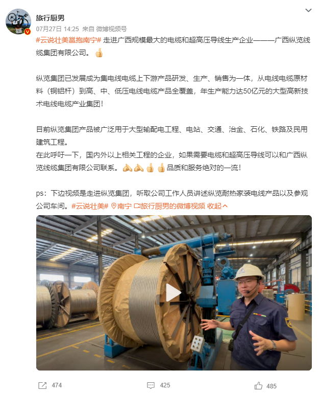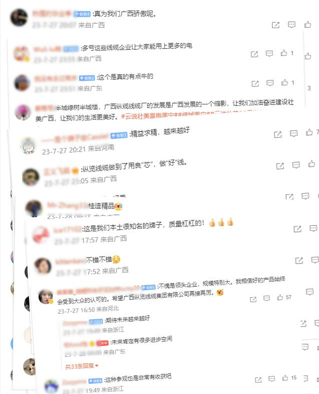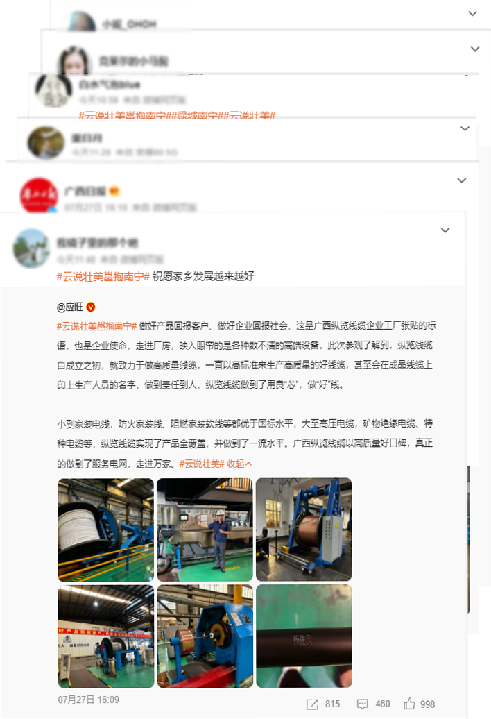 7月27日,由自治區(qū)網(wǎng)信辦組織的“云說壯美繪錦繡”——網(wǎng)絡(luò)名人看廣西主題活動走進(jìn)縱覽線纜集團進(jìn)行采風(fēng)。來自全國各地近40位網(wǎng)絡(luò)名人、媒體記者在縱覽線纜集團感受了廣西線纜高端品牌的鑄就過程以及在服務(wù)地方社會經(jīng)濟發(fā)展中所展現(xiàn)的作為擔(dān)當(dāng)。董事長助理吳培軍、陳楊陪同接待,副總工程師蘇宏發(fā)為各位網(wǎng)絡(luò)名人全程講解,帶領(lǐng)大家一起探索縱覽線纜的奧秘。 活動期間,蘇宏發(fā)副總工用鮮活的語言向參訪團展示了縱覽線纜集團獨特的企業(yè)文化、平臺建設(shè),深入車間感受工藝生產(chǎn)制造流程,切實感受電線電纜生產(chǎn)制造的過程,了解產(chǎn)品生產(chǎn)質(zhì)量把控、產(chǎn)品監(jiān)管、產(chǎn)品溯源等經(jīng)營管理理念。 實地參觀后,董事長助理吳培軍向來訪的網(wǎng)絡(luò)名人們做了題為“廣西縱覽線纜集團高質(zhì)量發(fā)展之路”的匯報。介紹了縱覽線纜集團在高質(zhì)量發(fā)展道路上的做法、成效以及榮獲自治區(qū)主席質(zhì)量獎、南寧市市長質(zhì)量獎的過程,讓網(wǎng)絡(luò)名人團更加了解縱覽線纜集團作為全國工業(yè)品牌培育示范企業(yè)、廣西工業(yè)龍頭企業(yè)的使命擔(dān)當(dāng)。 網(wǎng)絡(luò)名人@小滿在微博感慨:在廣西縱覽線纜集團有限公司,參觀、感受了各個制作流程的設(shè)備,感慨于該企業(yè)堅持“做最好的線纜”的決心,不愧是廣西電線電纜領(lǐng)域的領(lǐng)頭羊。 網(wǎng)絡(luò)名人@應(yīng)旺:小到家裝電線、防火家裝線、阻燃家裝線等都優(yōu)于國標(biāo)水平,大至高壓電纜、礦物絕緣電纜、特種電纜等,縱覽線纜集團實現(xiàn)了產(chǎn)品全覆蓋,并做到了一流水平。廣西縱覽線纜以高質(zhì)量好口碑,真正做到了服務(wù)電網(wǎng),走進(jìn)萬家。 網(wǎng)絡(luò)名人@旅行廚男在微博上感嘆縱覽線纜的產(chǎn)品,甚至為縱覽線纜集團打了一波廣告! 評論區(qū)也在為縱覽打call:“縱覽線纜做到了用良“芯”,做好線”;“真抓實干、奮力爭先,在推動廣西高質(zhì)量發(fā)展上展現(xiàn)更大擔(dān)當(dāng)、更大作為”;“做好‘芯’,牽好‘線’,廣西牌子,值得你擁有”.... 縱覽線纜集團專注“服務(wù)電網(wǎng),走進(jìn)萬家”戰(zhàn)略目標(biāo),堅持“做好產(chǎn)品回報客戶,做好企業(yè)回報社會,就是對黨和國家最大的忠誠”經(jīng)營理念。作為廣西標(biāo)桿企業(yè)、廣西工業(yè)龍頭企業(yè)、廣西名牌企業(yè),縱覽線纜集團將不忘初心,堅持持續(xù)高質(zhì)量發(fā)展,為壯美廣西經(jīng)濟建設(shè),積極貢獻(xiàn)縱覽力量。 |