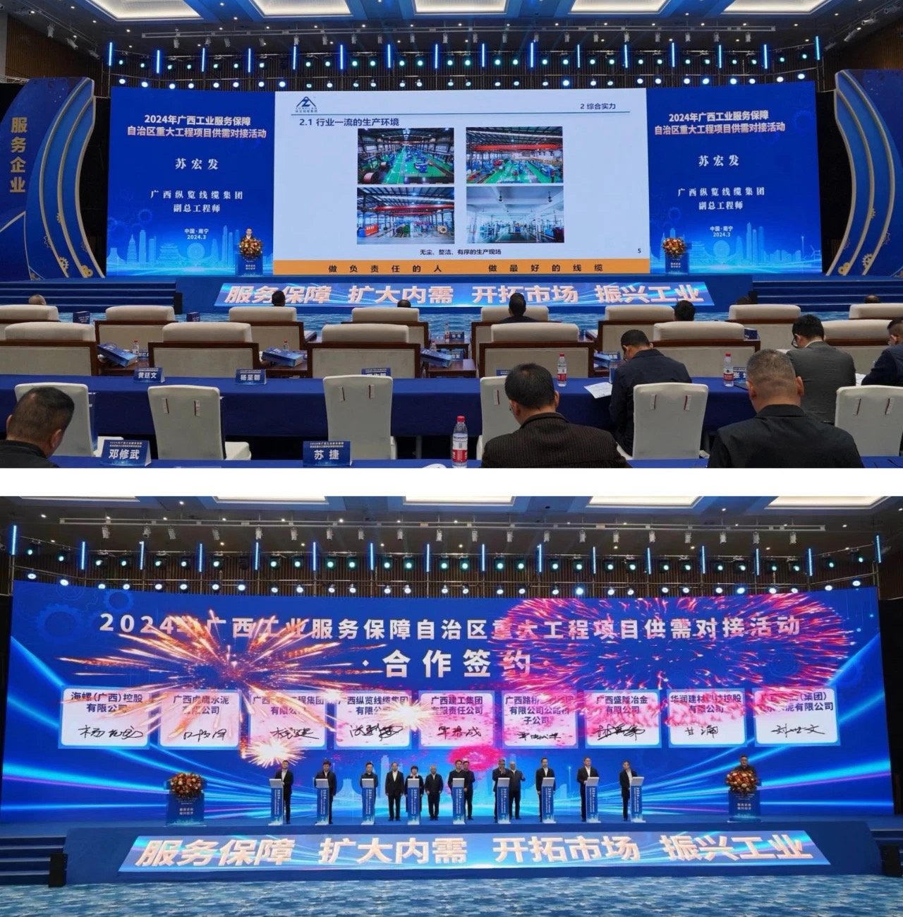 ? 3月4日,由自治區(qū)工信廳、交通運輸廳、水利廳聯(lián)合主辦,住建廳協(xié)辦的廣西工業(yè)服務(wù)保障自治區(qū)重大工程項目供需對接大會在南寧國際會展中心隆重舉行。會上,縱覽線纜集團作企業(yè)經(jīng)營發(fā)展情況匯報,并成為廣西線纜行業(yè)唯一成功簽約重大業(yè)務(wù)合作的線纜企業(yè)。 會上,自治區(qū)工信廳廳長王永超,交通運輸廳廳長劉可、水利廳副廳長黃學(xué)超先后致辭。自治區(qū)交通運輸廳、水利廳、各設(shè)區(qū)市政府領(lǐng)導(dǎo)出席會議,各市工信部門負責人、全區(qū)汽車、機械、鋼鐵(建材)、水泥、有色金屬等行業(yè)重點企業(yè),中直、區(qū)直重點企業(yè)代表共計300多人參加了本次活動。集團總經(jīng)理陳思行、董事長助理吳培軍、陳楊、張彩菊及市場部負責人、業(yè)務(wù)骨干參加會議,集團副總工程師蘇宏發(fā)代表公司作企業(yè)匯報。 一直以來,縱覽線纜集團始終堅持“做負責任的人,做最好的線纜”的愿景,在實際工作中踐行“做好產(chǎn)品回報客戶、做好企業(yè)回報社會就是黨和國家最大的忠誠”的理念。集團所取得的成績得到了國家有關(guān)部委、自治區(qū)各級政府,工信廳,住建廳、市場監(jiān)管局等職能部門的認可,成為廣西線纜行業(yè)唯一榮獲國家工信部“全國工業(yè)品牌培育示范企業(yè)”,“自治區(qū)主席質(zhì)量獎”、“南寧市市長質(zhì)量獎”等榮譽的企業(yè)??v覽線纜集團在自治區(qū)產(chǎn)業(yè)振興三年行動的引領(lǐng)下,榮獲了“國家級綠色工廠”、“國家知識產(chǎn)權(quán)優(yōu)勢企業(yè)”、“廣西智能工廠示范企業(yè)”、“廣西工業(yè)龍頭企業(yè)”、“廣西工業(yè)企業(yè)質(zhì)量管理標桿”等榮譽??v覽線纜集團已發(fā)展成為代表廣西、走出廣西,服務(wù)高端市場、高端客戶的行業(yè)知名品牌,將繼續(xù)堅持守正創(chuàng)新,為服務(wù)廣西社會經(jīng)濟高質(zhì)量發(fā)展貢獻新的更大力量。 |